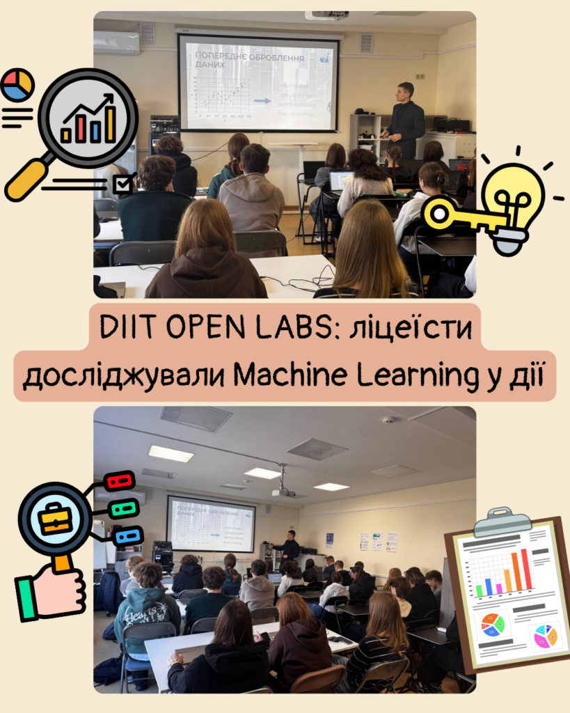 25 листопада 2025 року ліцеїсти взяли участь у DIIT OPEN LABS, організованому ННІ «Дніпровський інститут інфраструктури і транспорту» УДУНТ. Тема зустрічі — Machine Learning.