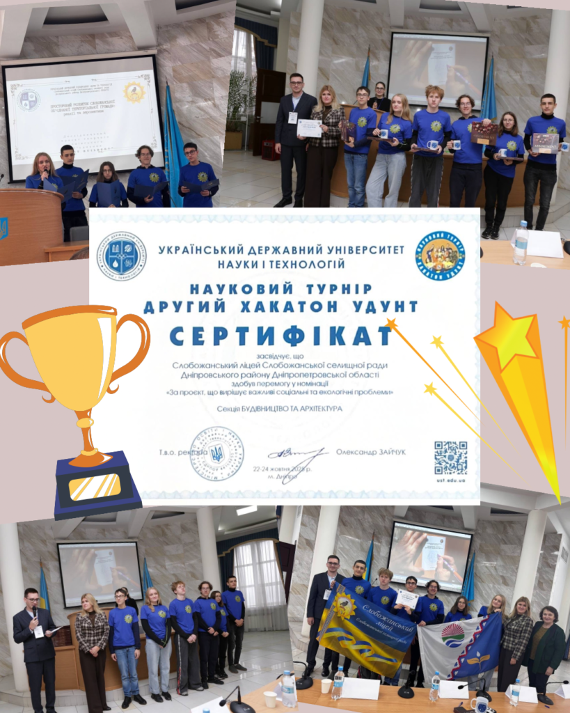 Від Слобожанського ліцею програму хакатону в секції «Будівництво і архітектура» успішно виконала команда учнів «Smart builders» в складі: від 11-Б класу, Божков Кирило, Джунь Софія, Юдін Богдан, Яловий Владислав, та від 10-А класу, Єрошенко Євгенія, Колихалов Вячеслав і Машевський Дмитро. Керівники команди – Лідія Макаренко і Юлія Шеремет.