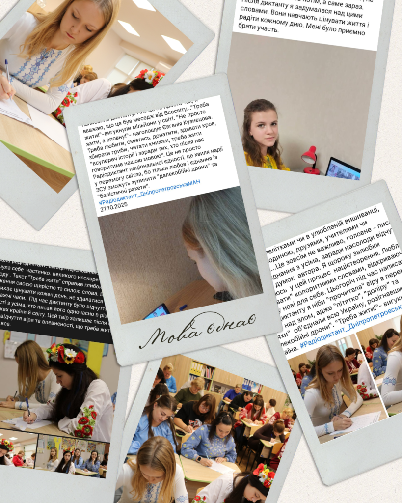 Зеленська Марія та Очкур Валерія, вихованки лінгвістичного гуртка «Чари рідного слова» (керівник Наталія Сидоренко) позашкільного підрозділу Слобожанського ліцею, а також учениці 10-А класу Чорногор Поліна та Єрошенко Євгенія (керівник Тетяна Павлик) долучилися до написання Всеукраїнського радіодиктанту національної єдності, присвяченого Дню української писемності та мови, і взяли участь в онлайн-флешмобі «Мова єднає», що організований Дніпропетровським відділенням Малої академії наук України.