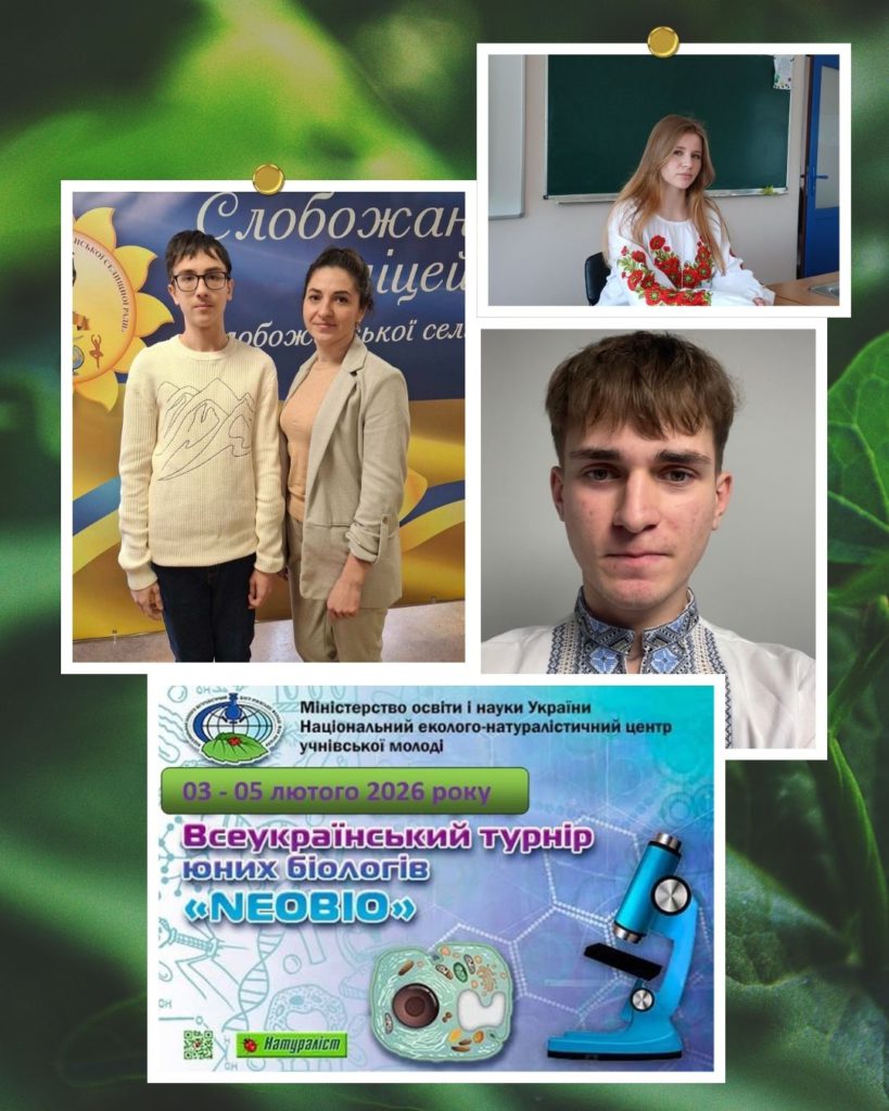 Кирило Божков, вихованець гуртка «Юні біологи-дослідники» (керівник Юлія Солодовник) позашкільного підрозділу Слобожанського ліцею пройшов відбірковий етап і 03-05 лютого 2026 року взяв участь в півфінальній грі та виборов можливість дійти до суперфінального командного етапу Всеукраїнського турніру юних біологів «Neobio», організованого Національним еколого-натуралістичним центром учнівської молоді Міністерства освіти і науки України спільно з провідними науковими установами країни: із Київським національним університетом імені Тараса Шевченка, Національним університетом «Києво-Могилянська академія», Українським державним університетом імені Михайла Драгоманова, Інститутом ботаніки ім. М. Г. Холодного, Інститутом гідробіології НАН України, Інститутом біохімії імені О.В. Палладіна НАН України, Інститутом харчових технологій та геноміки НАН України.