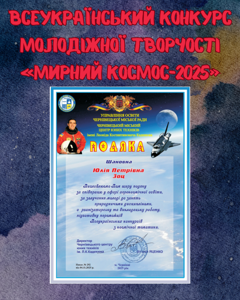 Керівник гуртка Юлія Зоц отримала Подяку від  Чернівецького міського центру юних техніків імені Леоніда Костянтиновича Каденюка за тісну співпрацю у сфері аерокосмічної освіти, за залучення молоді до занять природними дисциплінами, організаторську, викладацьку роботу та підготовку переможців Всеукраїнських конкурсів з космічної тематики.