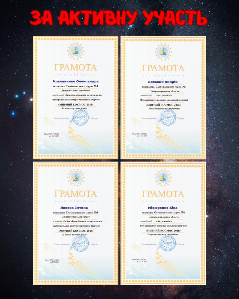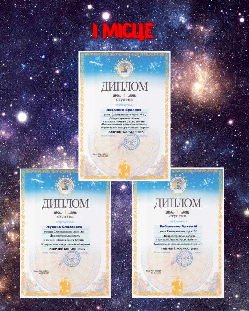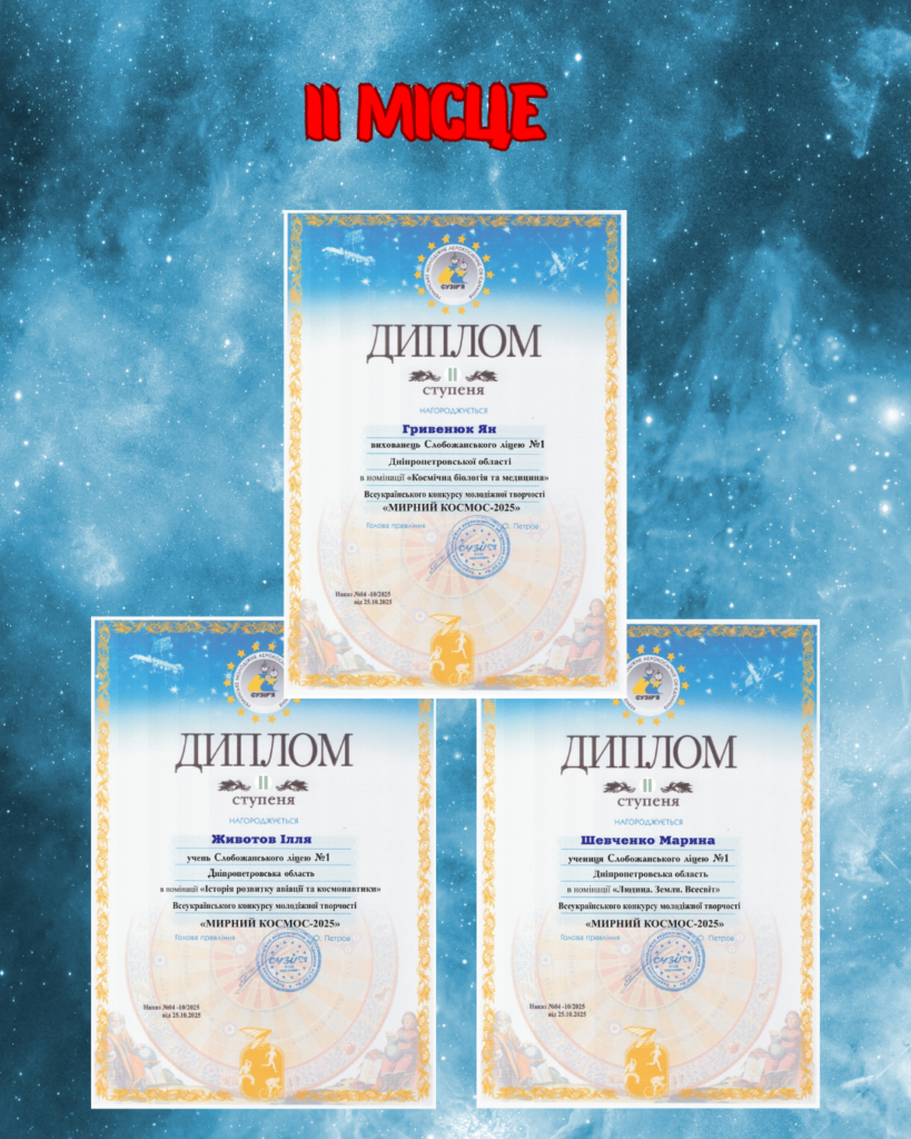 Вихованці гуртка «Астрономічний» позашкільного підрозділу Слобожанського ліцею в онлайн форматі взяли участь у Всеукраїнському конкурсі молодіжної творчості «Мирний космос-2025», який об’єднав юних дослідників і мрійників про зорі.