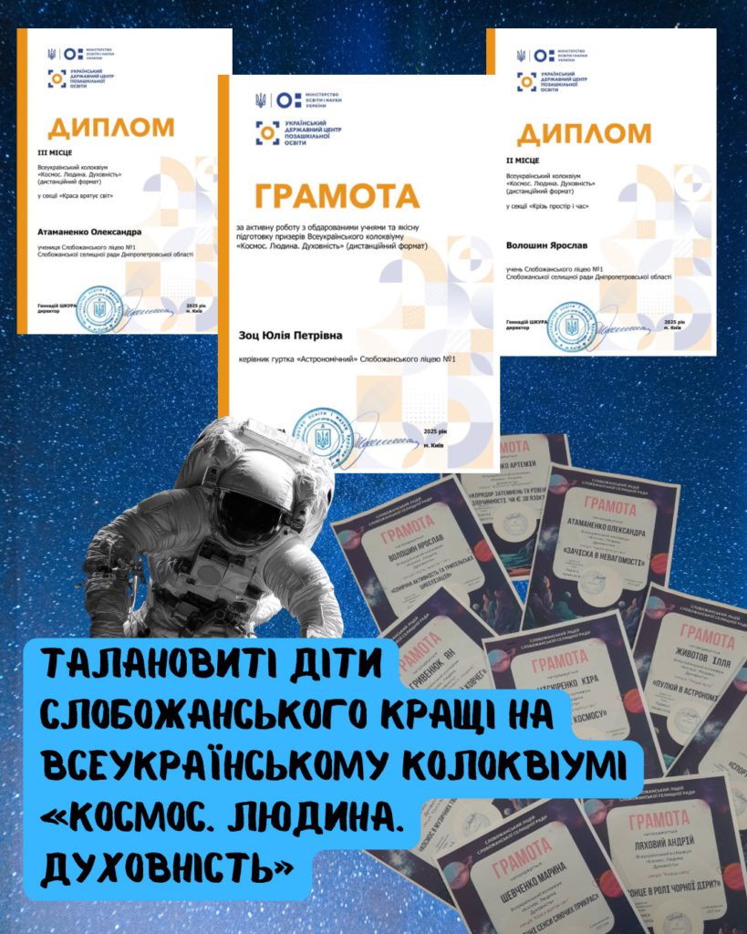 Багаторічною доброю традицією для вихованців гуртка «Астрономічний» (керівник — Юлія Зоц) позашкільного підрозділу Слобожанського ліцею є участь у Всеукраїнському колоквіумі для школярів «Космос. Людина. Духовність». Захід об’єднує юних дослідників з різних куточків України та надає їм можливість презентувати власні проєкти, присвячені освоєнню космічного простору, особливостям поведінки людини в екстремальних умовах (стихійні лиха, війна, екологічні катастрофи, космічні польоти), а також питанням формування духовності й сучасної наукової картини світу.
