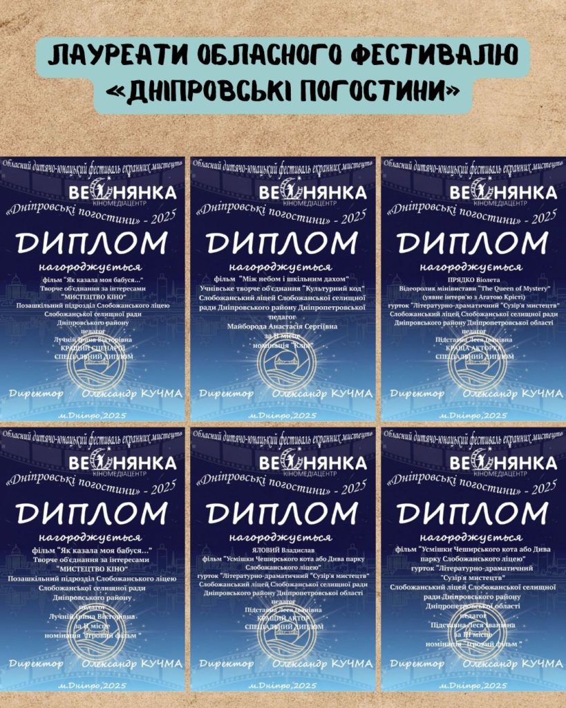 3 07.10.2025 по 07.11.2025 в заочному форматі проводився обласний дитячо-юнацький фестиваль екранних мистецтв «Дніпровські Погостини». До участі у Фестивалі було подано 127 творчих робіт, у створенні яких взяли участь 685 здобувачів освіти з 19 територіальних громад (міських, селищних, сільських), трьох закладів Дніпропетровської обласної ради та одного закладу Житомирської обласної ради.
