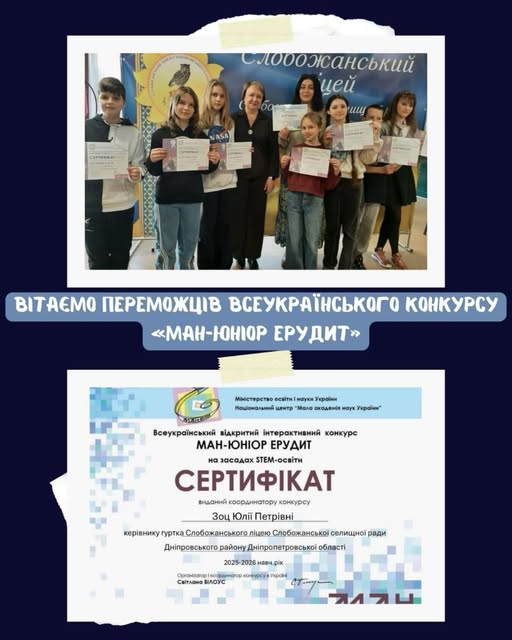У Всеукраїнському інтерактивному конкурсі «МАН-Юніор Ерудит» на засадах STEM-освіти взяли участь вихованці гуртка «Астрономічний» (керівник Юлія Зоц) позашкільного підрозділу Слобожанського ліцею.