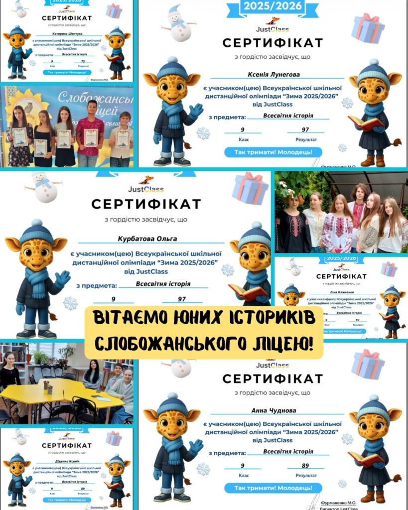 Пишаємося досягненнями 27 юних істориків 9-х класів Слобожанського ліцею, які під керівництвом вчителя історії Олени Сотули  взяли участь у Всеукраїнській олімпіаді «Зима 2025/2026» від освітньої платформи JustClass  і показали чудові результати.