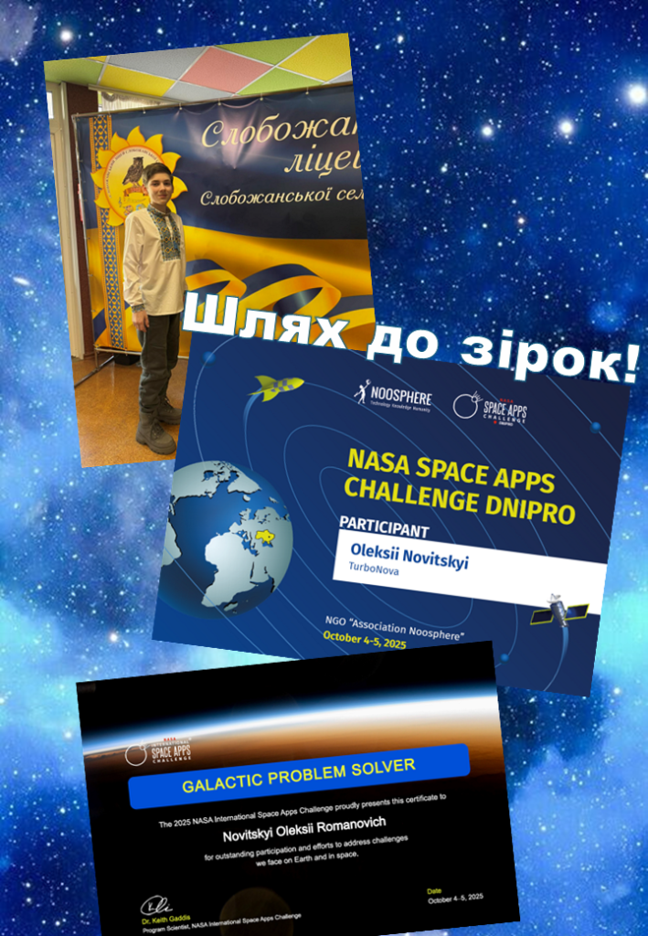 Щиро вітаємо Новіцького Олексія, учня 10-А класу Слобожанського ліцею, вихованця гуртка «Мехатроніка» Дніпропетровського відділення Малої академії наук України, лідера команди “TurboNova” з перемогою в кваліфікаційному етапі  конкурсу NASA Space Apps Challenge.